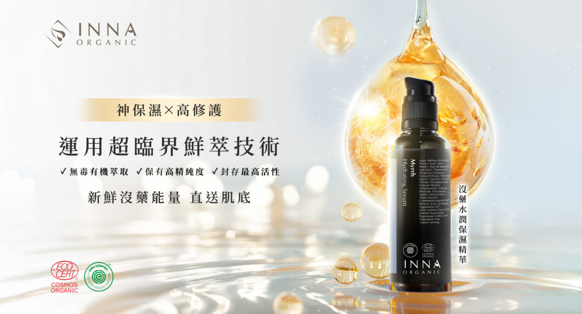 有機保養品除了是採用天然純淨的植萃成分,更結合了最新科技來放大保濕的效果。inna 第 4 代法國專利「三重水循環科技 AQUAXYL™」的應用,能夠構建肌膚內部各肌層的超循環能量,讓保濕變得更加持久和深入。此外,更結合「超臨界沒藥鮮萃技術」,保留没藥精油最原始香氣和最活性的成分,為肌膚帶來前所未有的深層保濕體驗。