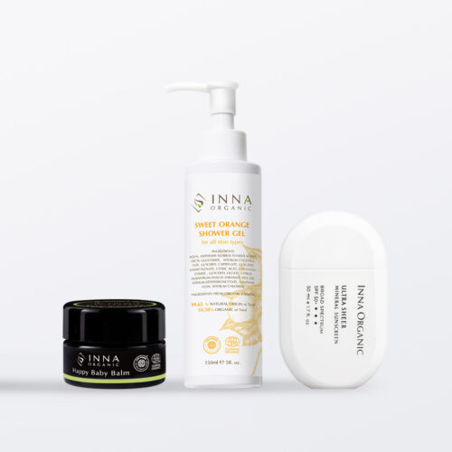 內含:海棠菁萃防曬乳 50ml、舒心萬用膏 10ml、純真橙淨洗手沐浴露 150ml