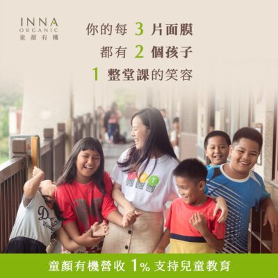 INNA ORGANIC 將每年營收的 1% 用來支持弱勢兒童教育,因為我們深信愛護這個世界與地球,就要從給予「教育」開始,從小做起。破壞的力量及影響遠比重建來的大,INNA ORGANIC 選擇支持兒童教育,將永續種子種在他們的心中,期盼形成正向循環,讓弱勢族群兒童的未來也能有機會邁向世界。