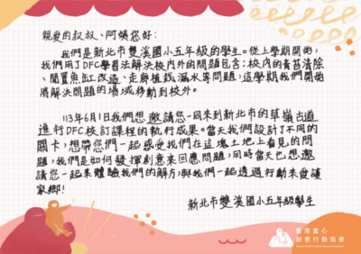 雙溪國小是 DFC 臺灣第 10 所種子學校,位於新北市雙溪區,位處東北角雙溪河流域畔的偏鄉小學,因地理位置關係親近著溪流與古道,也成為了他們最天然的自然生態教室。112 年起 DFC 臺灣團隊率領雙溪國小 5 位教師,陪伴五、六年級的雙溪孩子從校園環境走入社區,結合淡蘭古道,將雙溪所擁有獨特的生態資源融入在 DFC 課程中,重新看見家鄉。