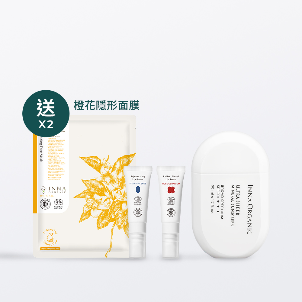 內含:海棠菁萃防曬乳 50ml、玫瑰天竺葵好氣色舒緩潤唇精華 10ml、乳香撫紋潤唇精華 10ml、橙花光采嫩白隱形面膜2片